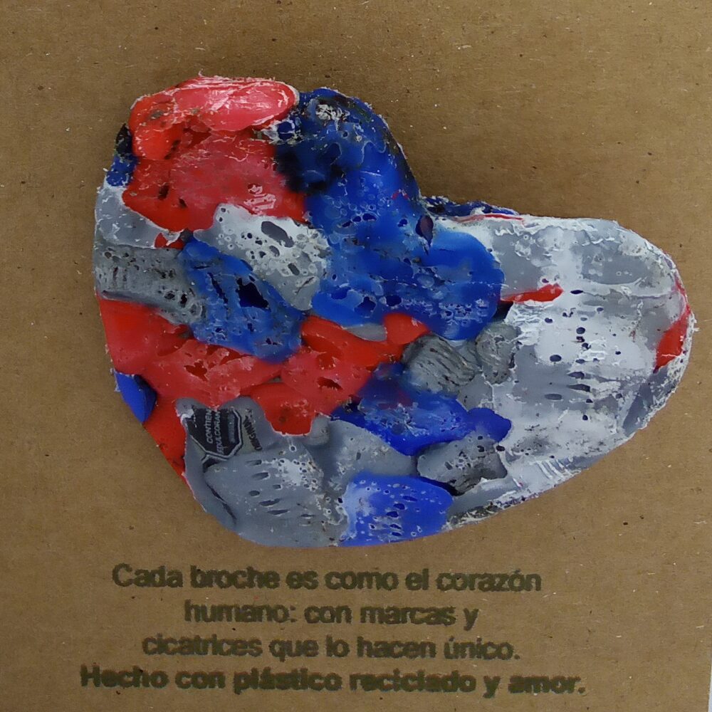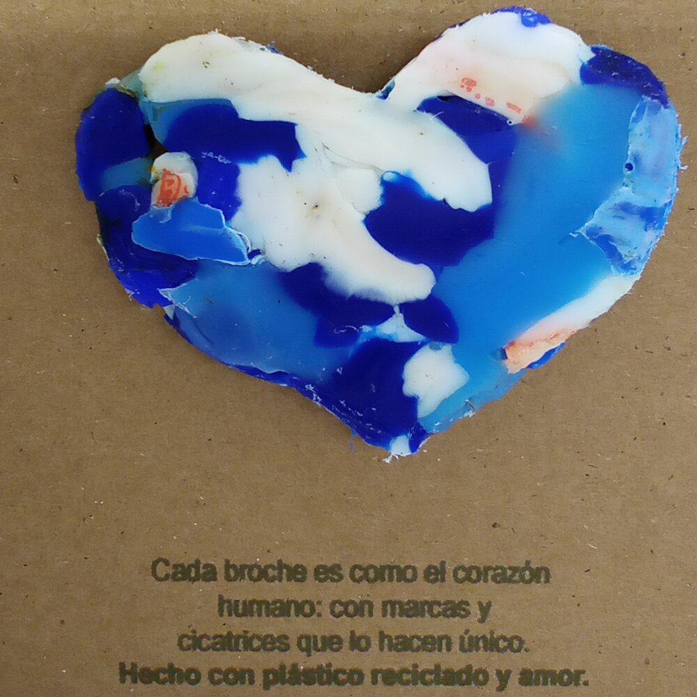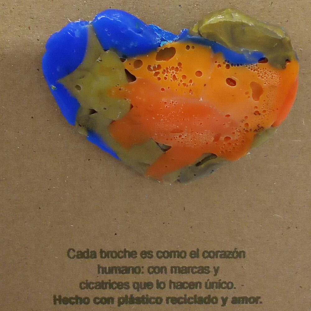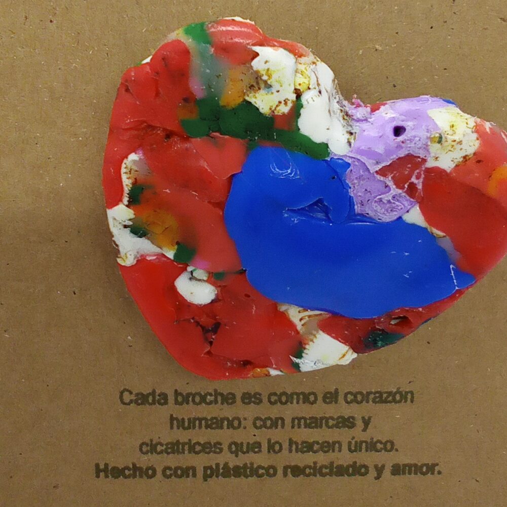 «Cada broche es como el corazón humano: con marcas y cicatrices que lo hacen único. Hecho con plástico reciclado y amor»,