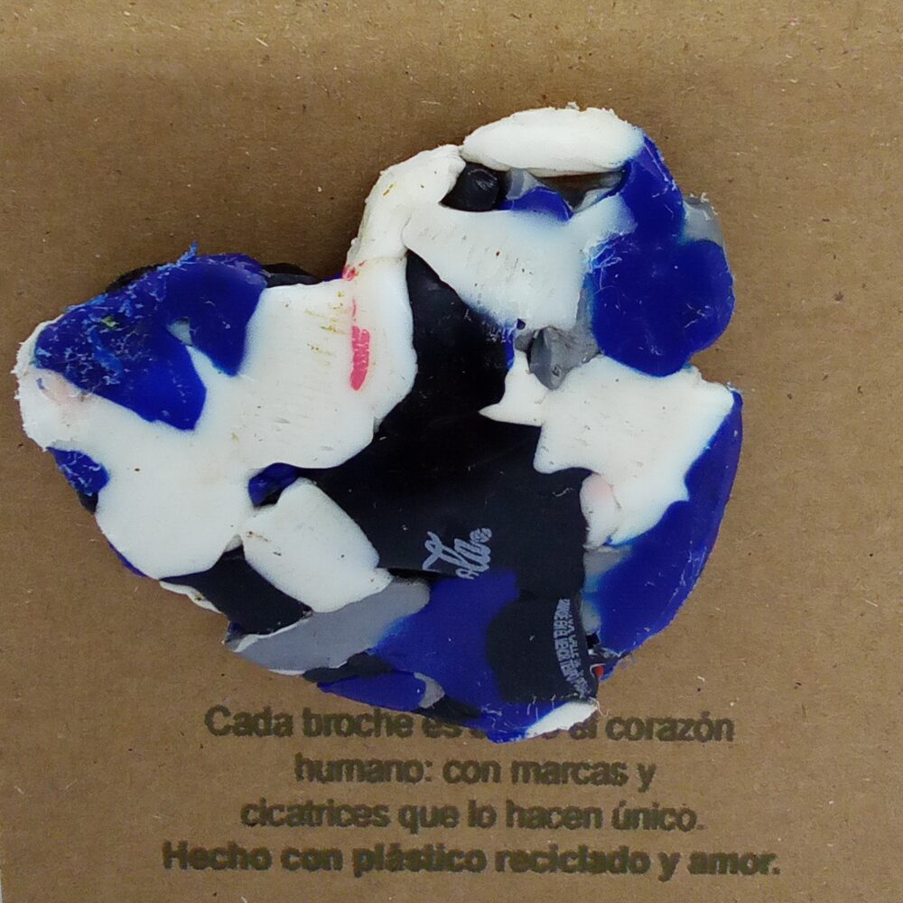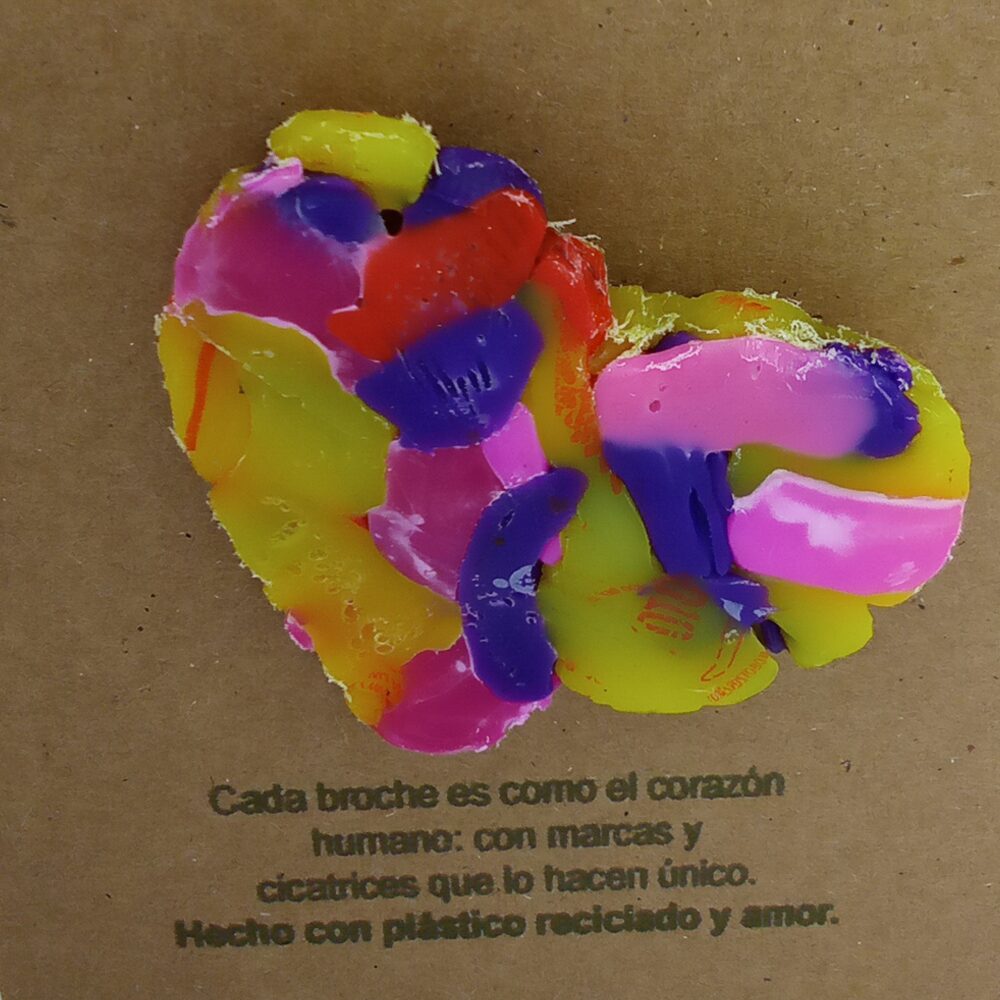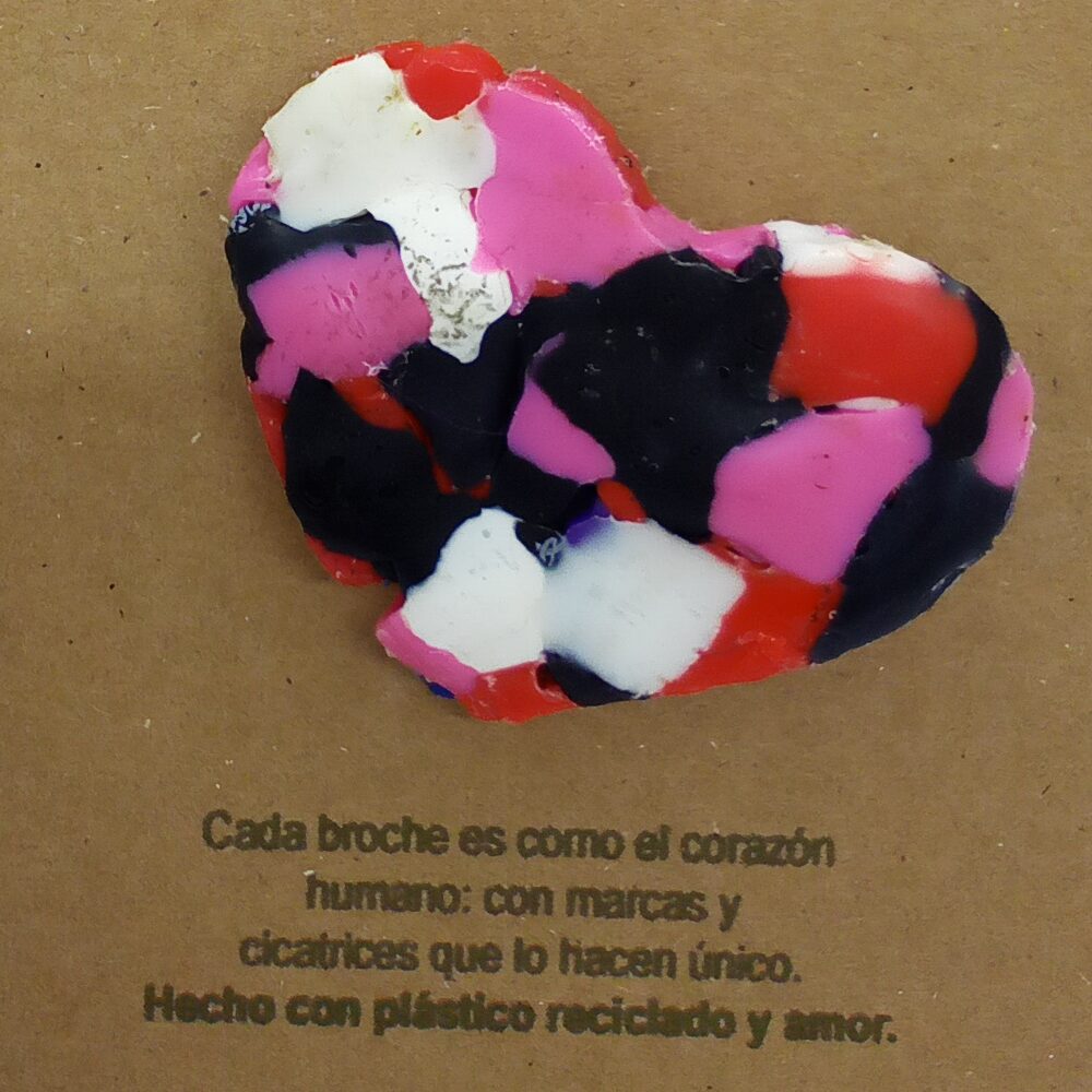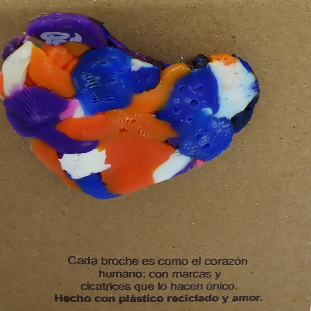 «Cada broche es como el corazón humano: con marcas y cicatrices que lo hacen único. Hecho con plástico reciclado y amor»,